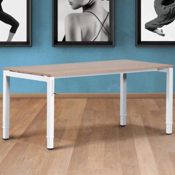 Je kunt de werkhoogte eenvoudig aanpassen door aan de slinger te draaien tot de gewenste hoogte bereikt is. Voor een ergonomische zithouding is het belangrijk dat je onderarmen horizontaal op het werkblad rusten en je knieën in een hoek van ongeveer 90 graden staan met beide voeten plat op de grond. Voor optimale ergonomie wordt aangeraden om het bureau te combineren met een instelbare bureaustoel en eventueel een monitorarm.
