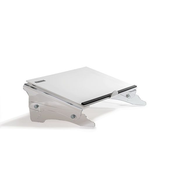 De Flexdesk kan ook als lessenaar worden gebruik. Door het werkblad naar beneden te schuiven bevindt deze zich op de juiste locatie om de documenthouder te gebruiken om te lezen en te schrijven.