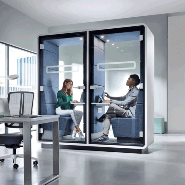 Hush Twin bestaat uit twee verbonden units, elk met een eigen sofa, bureau, verlichting en ventilatie. Deze unit is breder dan de Hush phone, maar compacter dan de Hush Work; beide ‘helften’ bieden de benodigde ruimte om in stilte en privacy te werken. Deze akoestische werkplek is zeer geschikt om in te videobellen of om geconcentreerd werk in te doen. Ook te gebruiken als akoestische telefooncel / belcel / belhokje.