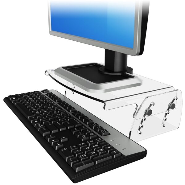 De standaard is eenvoudig in hoogte aan te passen van 7 cm tot 13 cm (70‑130 mm) dankzij vijf vaste standen. Het transparante acryl maakt het visueel subtiel en past in vrijwel elke kantoor‑ of thuiswerkplek. Dankzij de ruimte onder de standaard kun je je toetsenbord of laptop eenvoudig wegschuiven wanneer je die even niet gebruikt. Ideaal voor een opgeruimd bureau.