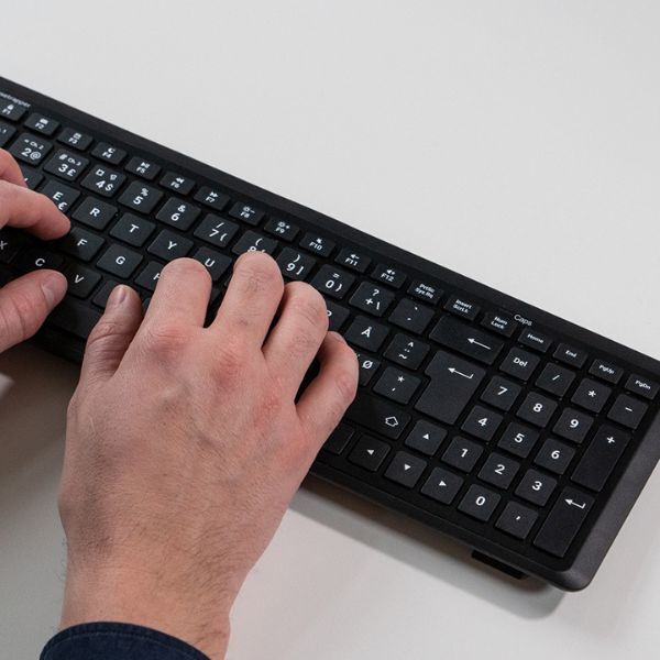 Hoewel compact, beschikt dit toetsenbord over een volledige QWERTY-indeling inclusief numeriek blok—ideaal voor gebruikers die vaak cijfers invoeren maar geen groot bureau hebben. Het ergonomisch toetsenbord is licht (480 gram), stijlvol en gemaakt van gerecycled plastic: een duurzame keuze die past bij moderne kantooromgevingen. Je neemt het eenvoudig mee van de ene werkplek naar de andere, ideaal voor flexplekken of hybride werken.