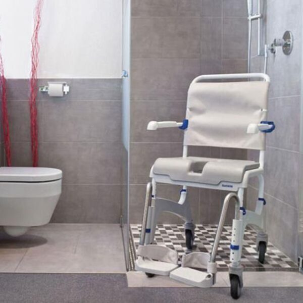 De Ocean douchestoel en toiletstoel is een degelijke verrijdbare stoel voor in de zorgomgeving. De douchestoel heeft een stabiel en roestvrij frame, waardoor de stoel in natte omgevingen kan worden gebruikt.