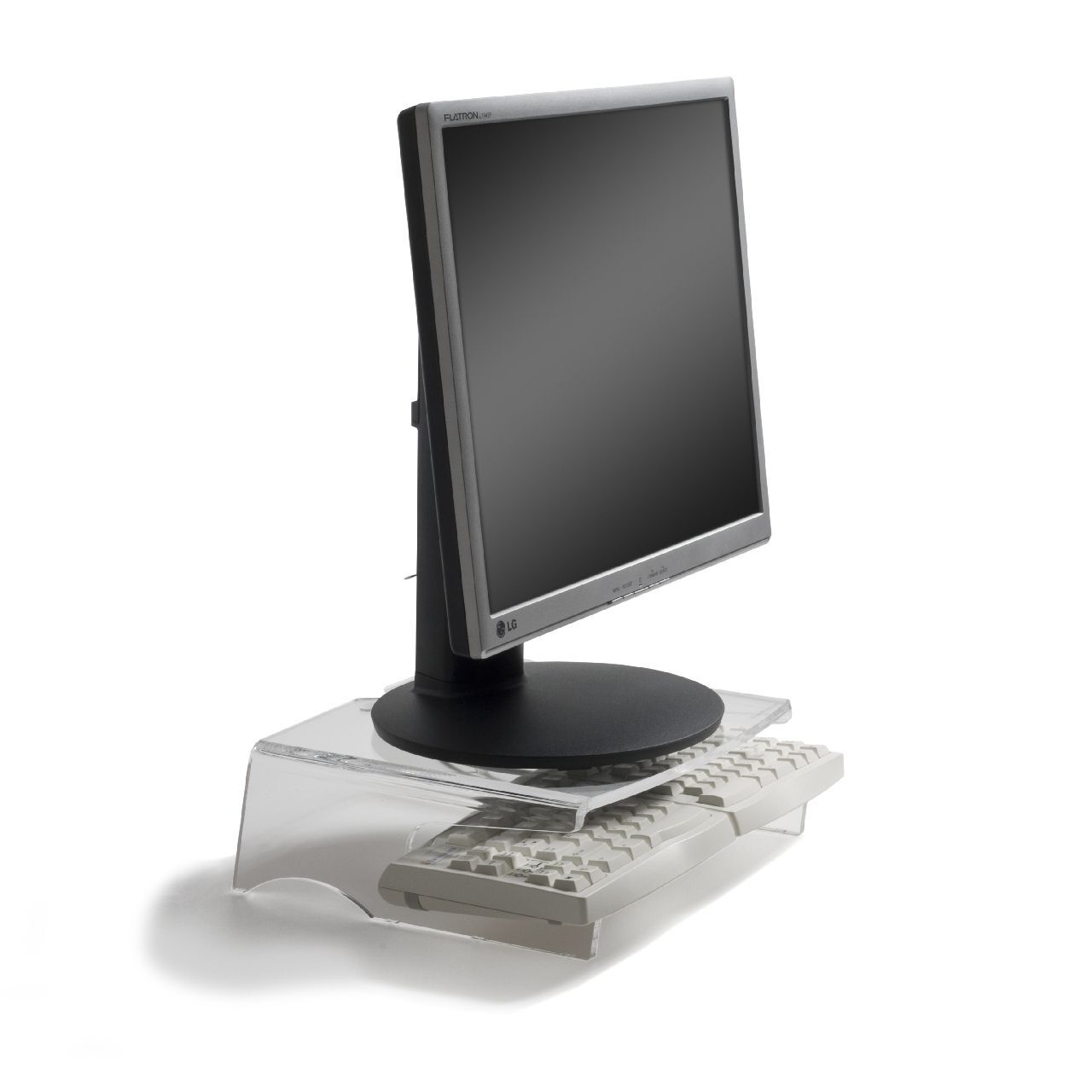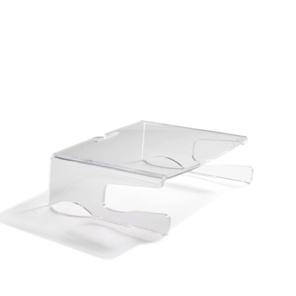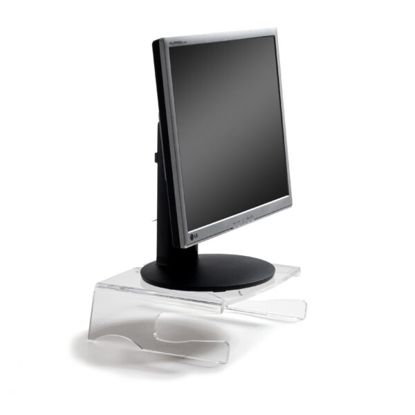 De monitorsteun Q-Riser 100 plaatst te laag staande beeldschermen op comfortabele werkhoogte.