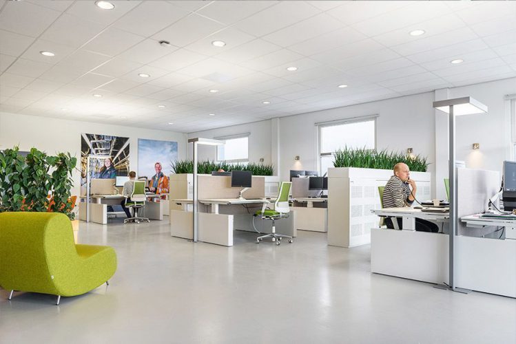 Het kantoorpand heeft een zeer hoog plafond. Om ervoor te zorgen dat de medewerkers ondanks het hoge plafond toch genoeg licht hebben om hun werk goed te doen hebben we bij ieder bureaublok een staande bureaulamp geplaatst. De Ergolight Up and Downlighter voorziet twee bureaus van de juiste werkplekverlichting en is dimbaar. Hierdoor is hebben de medewerkers van AB Vakwerk altijd genoeg licht!