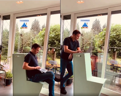 Op zijn foto toonde hij hoe hij thuis wisselwerkt en wint daarmee de Swopper. Hij maakt hier gebruik van zijn eigen StandChair.