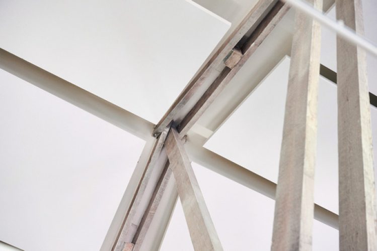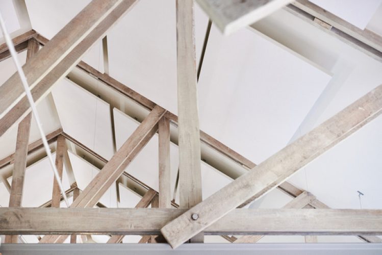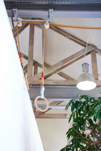 In alle drie de ruimtes hebben we gekozen voor witte akoestische plafondpanelen. In het kantoor hebben wij deze volledig in lijn met het dak en binnen de plafondbalken geplaatst, waardoor ze nauwelijks opvallen en de ruimte haar sfeer behoudt. In de conferentiezalen hebben wij ze onder en naast de luchtbehandelingskanalen geplaatst, zodat het industriële karakter niet verloren gaat.
