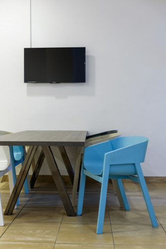 De tafel en bijpassende stoelen in de centrale hal zijn door ons geleverd, waarbij de kleuren samen met de manager Burgerzaken bedacht zijn. De gebruikte stoelen zijn gemaakt uit 1 stuk gebogen hout.