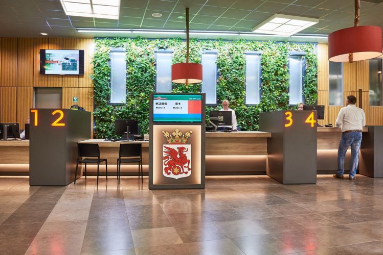 De ontvangstbalie met de verticale tuin – ook wel de Greenwall genoemd – is het hart van de ontvangstruimte. Uniek aan de balie is dat de bezoeker zelf de keuze kan maken voor een zit- of sta plek aan de balie. Daarmee is gemeente Ooststellingwerf één van de eerste gemeentes in Nederland, waar zowel de bezoeker als de medewerker de mogelijkheid heeft om aan de balie te zitten of te staan. Wij hebben dit uniek stukje maatwerk mogen leveren!