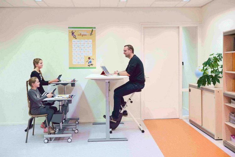Lammert vertelt dat ook de docenten moesten wennen aan de dynamische meubels. Bewegen tijdens de les is vrij nieuw in het onderwijs. ‘Maar voor ‘wiebel’ kinderen was de Swopper een goede oplossing. En met de grote tafel met de bureaufietsen in het midden van de klas voelde het huiselijker. Kinderen gingen er met z’n allen omheen staan om te overleggen, met én zonder docent.’ Aldus Lammert.