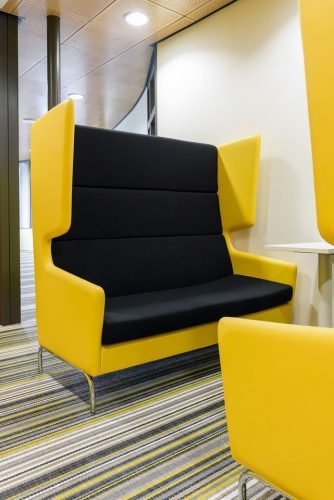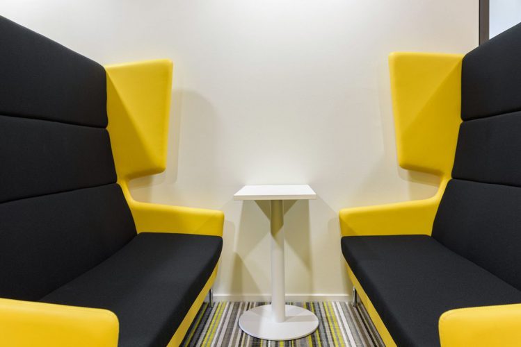 Daarom heeft Ziuz gevraagd om een akoestisch zitje te leveren op 1 van de gangen. Het zitje bestaat uit twee akoestische banken in de huisstijl kleuren en een tafel. Het zitje biedt informeel overleg voor 4 personen.