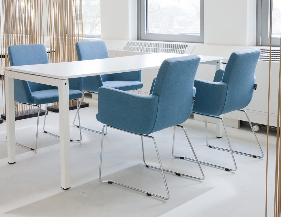 De stoel is direct inzetbaar. Of je nu kiest voor een sledeframe, spinvoet of kruisvoet op wielen, je creëert eenvoudig de juiste opstelling voor jouw situatie: vaste zit, flexibele vergaderruimte of wachtruimte.